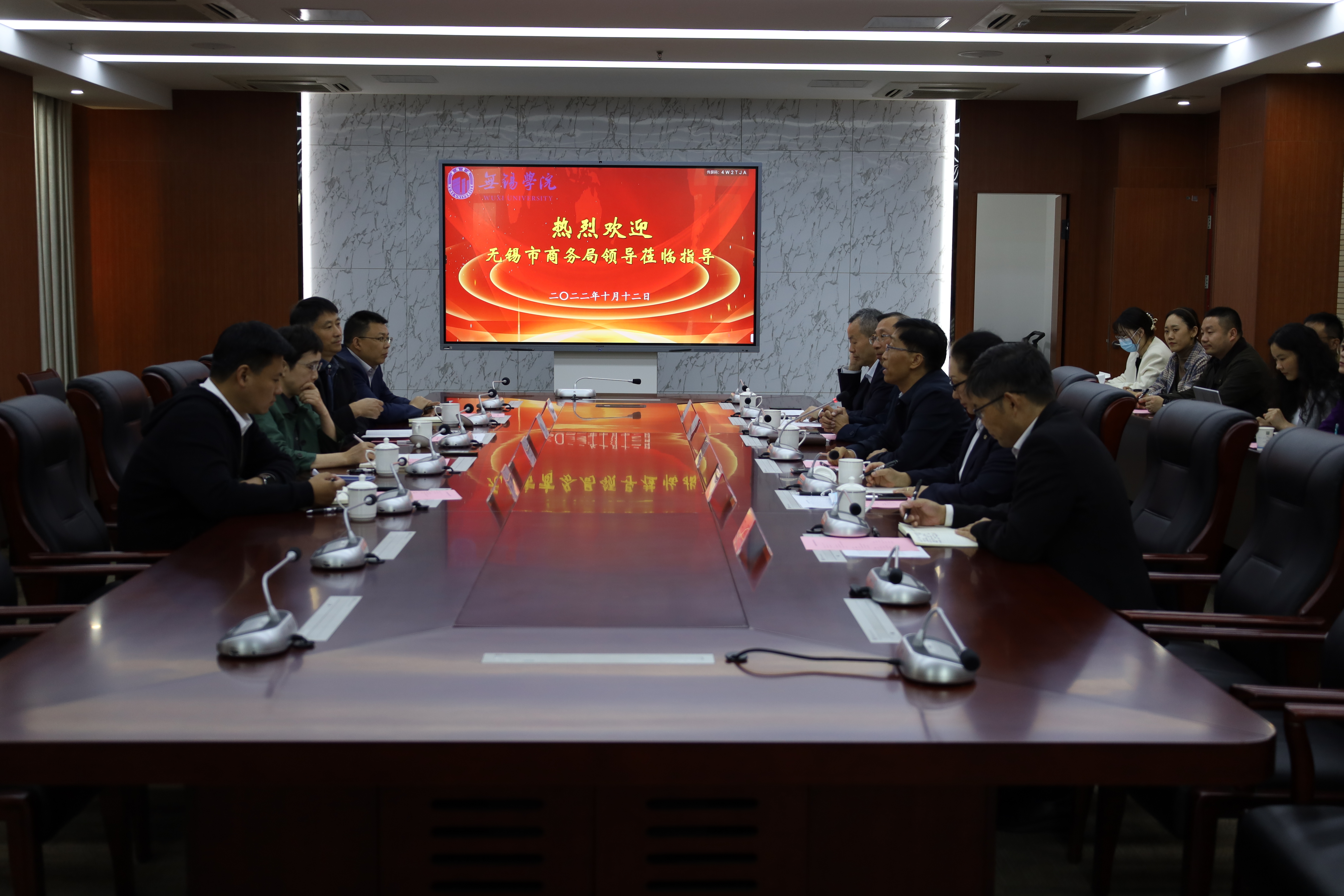 10月12日下午,无锡市商务局副局长宗继芳,跨境电商处原处长、四级调研员欧国君,电子商务和信息化处处长吴栋,锡山区商务局科长孙科军一行来校交流洽谈合作。校长张永宏,副校长梁惠娥,科技处负责人丁留贯,国教院负责人王勇,商学院负责人刘军及商学院教师代表参加座谈会。会议由梁惠娥主持。
