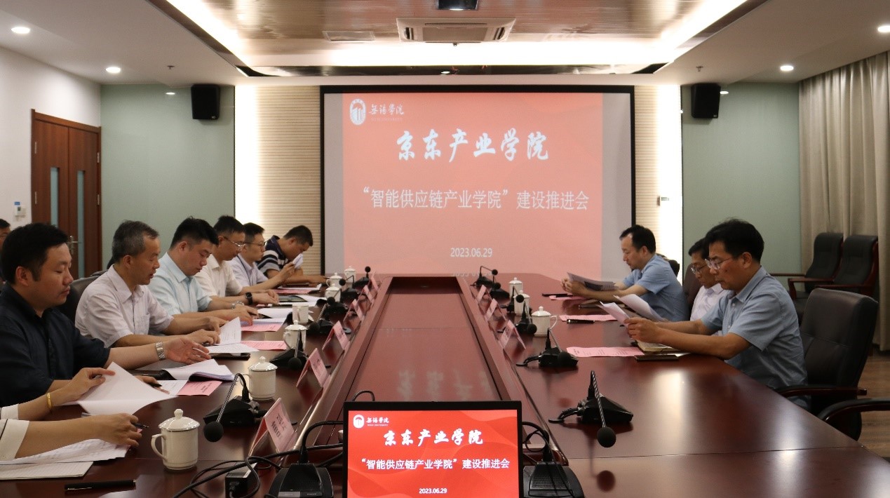 数字经济与管理学院院长刘军汇报了京东产业学院的初步建设方案,介绍了“智能供应链产业学院”理事会架构,讨论了实践教学基地建设、设立“京东物流班”的构想、联合培育产教融合教学成果等产业学院共建内容及预期产出效果。