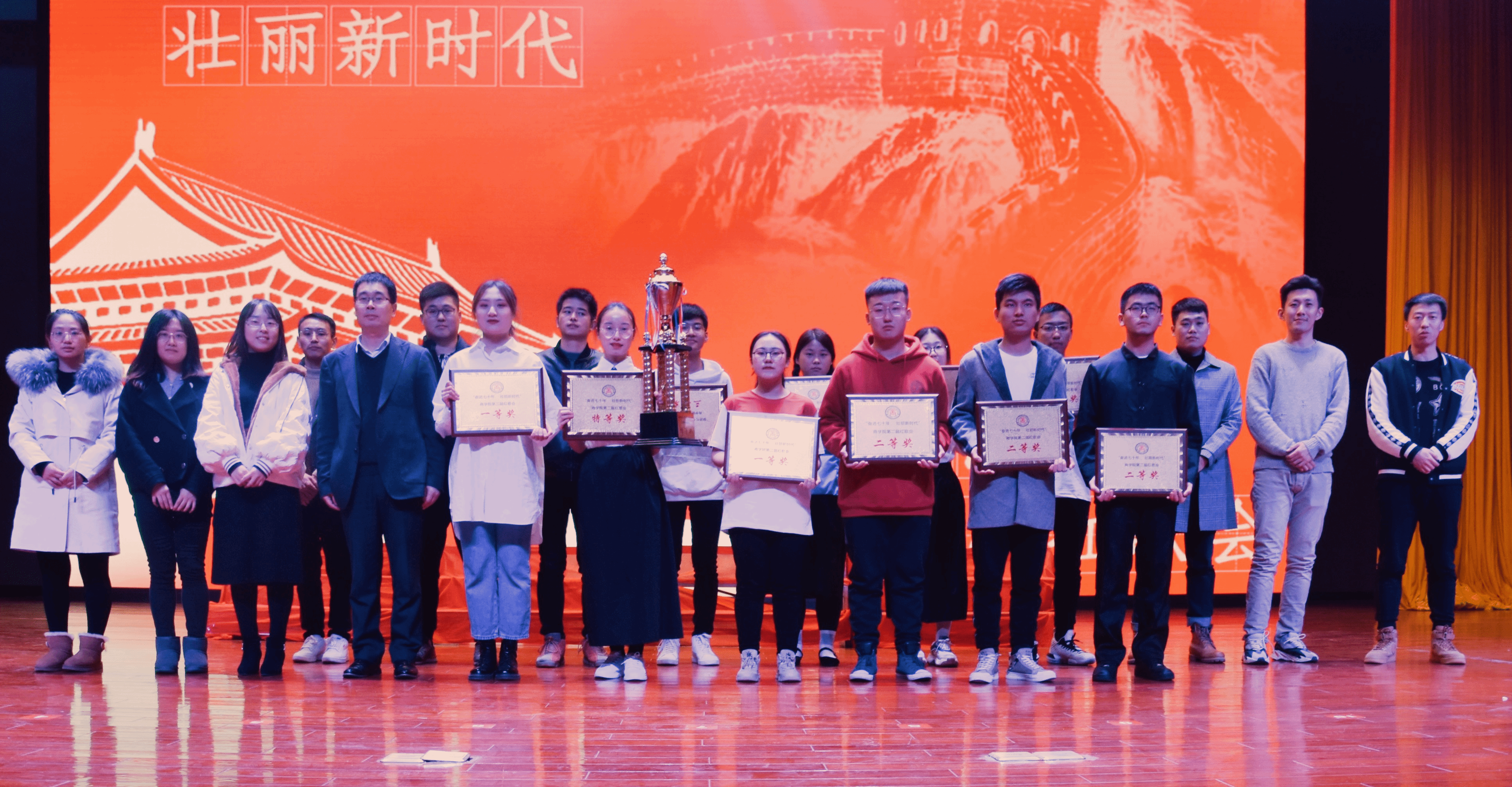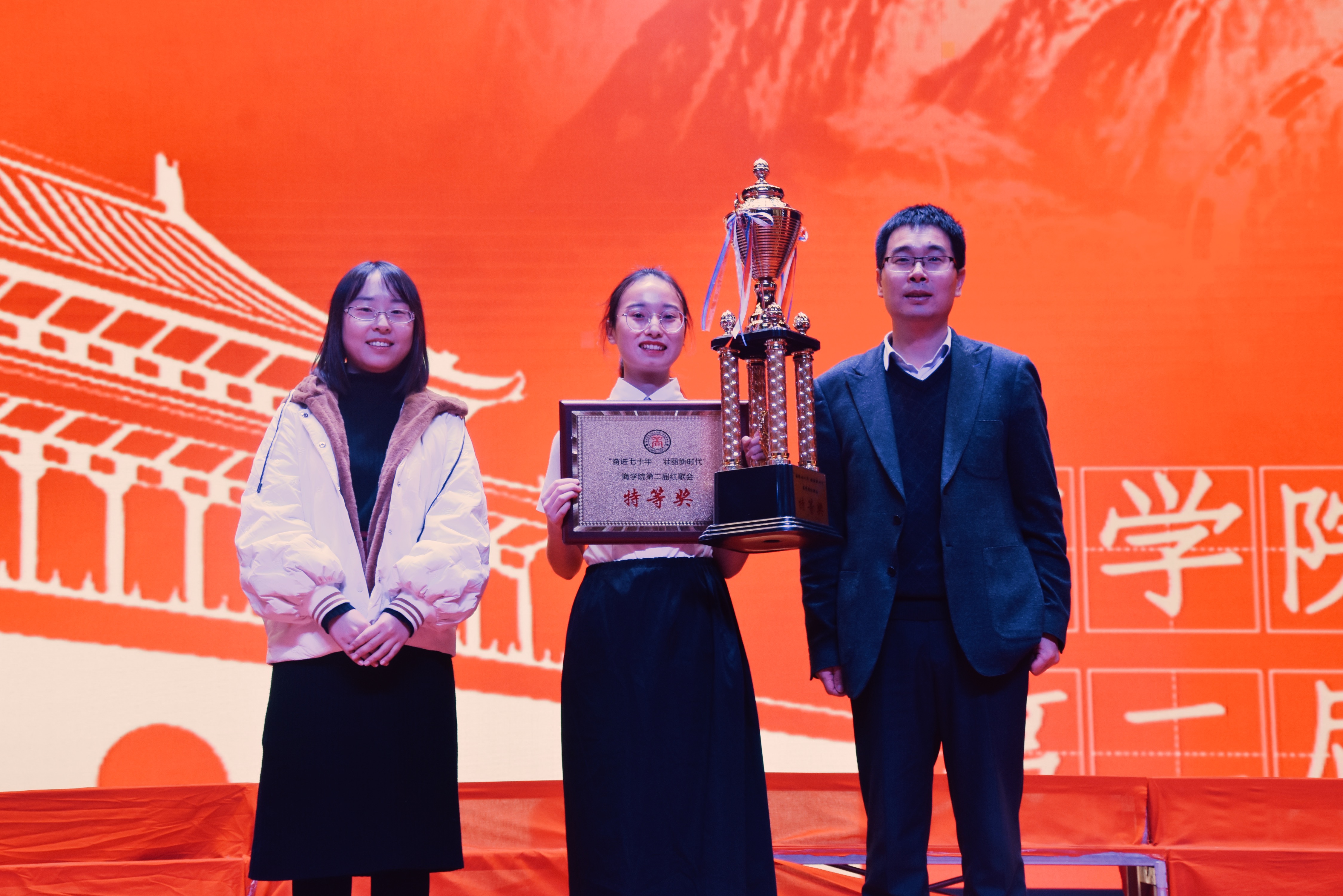 首先由李沛武副处长致开幕词,他介绍了商学院红歌会的由来,肯定了商学院红歌会带来的积极影响,希望这个比赛能够不断传承,成为商学院一大亮点。接着,比赛在19金融3班响亮的歌声中拉开帷幕。随后的整场比赛更是精彩纷呈,高潮迭起:一个又一个方阵,一支又一支红歌,一阵又一阵掌声、呼声,不断把比赛推向高潮。19支参赛班级上下场队列有序、服装整齐、精神饱满、歌声暸亮、激情昂扬,传唱经典红歌。《国家》、《红旗飘飘》、《大中国》、《我的中国心》、《北京的金山上》等一首首脍炙人口、广为传唱的红色歌曲响彻整个大礼堂。经过角逐,19人资1班的《北京的金山上》获得特等奖;19会计4、19市营1荣获一等奖;19金融2等3个班级荣获二等奖;19国贸1等4个班级荣获三等奖。最后,由孙振处长作总结发言并颁奖。至此,本次红歌大合唱比赛在热烈的掌声中落下了帷幕。