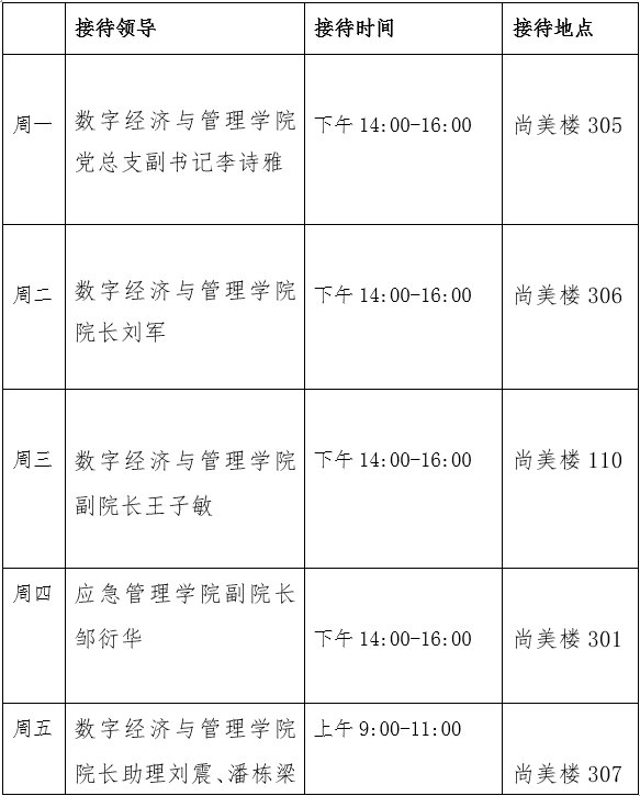 为广泛听取师生员工对学院改革、建设和发展的意见和建议,及时解决师生在工作、学习和生活中遇到的实际问题,学院建立了院领导接待日制度。现将院领导接待日安排公告如下: