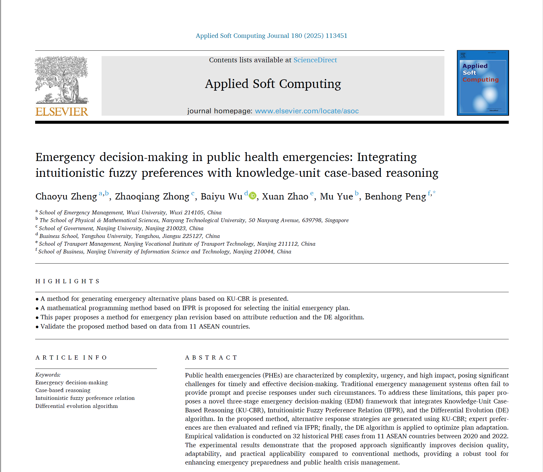 近日,我院郑超予博士在SCI来源期刊《Applied Soft Computing》发表题为“Emergency decision-making in public health emergencies: Integrating intuitionistic fuzzy preferences with knowledge-unit case-based reasoning”的学术论文。
