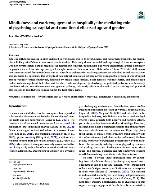 近日,我院刘娟副教授与刘军教授合作在SSCI收录期刊《Current Psychology》发表题为“Mindfulness and work engagement in hospitality: the mediating role of psychological capital and conditional effects of age and gender”的学术论文。