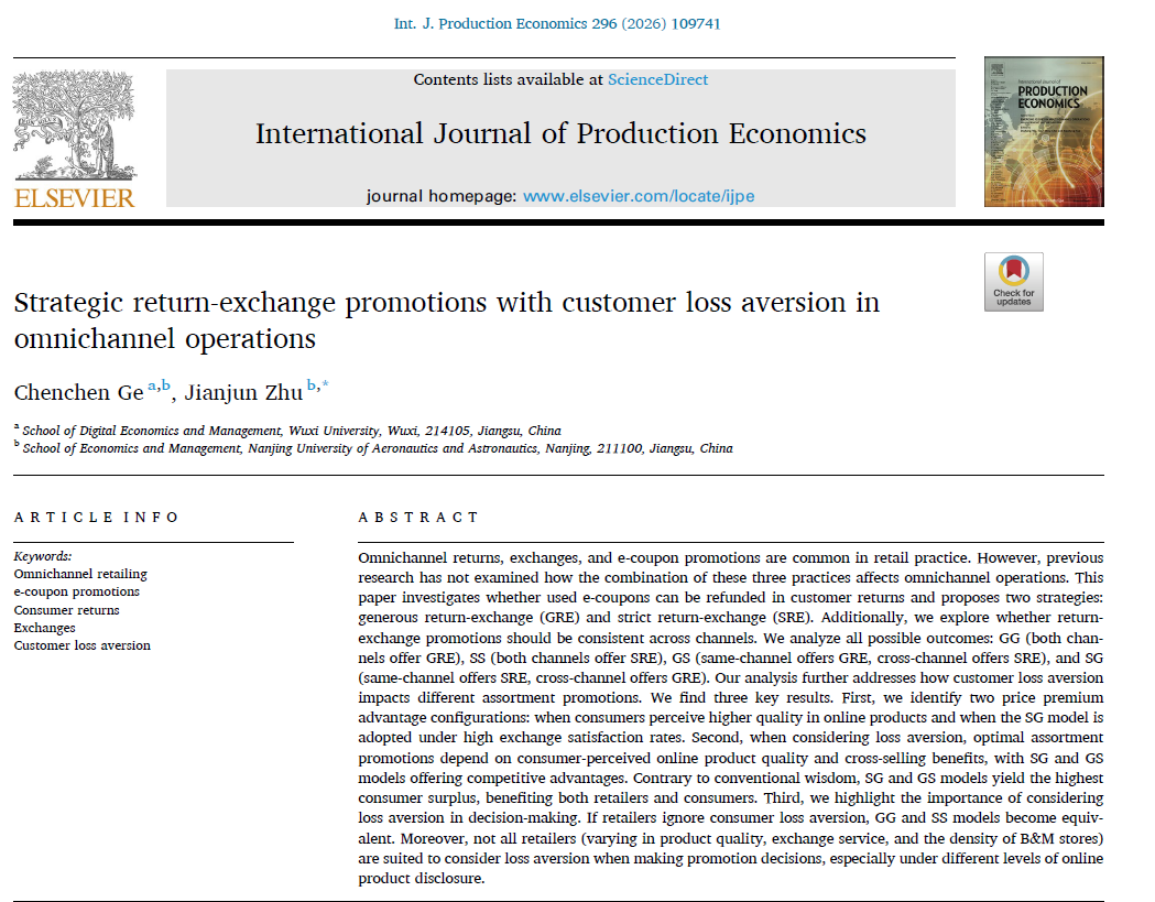 近日,我院葛晨晨博士在SCI来源期刊《International Journal of Production Economics》发表题为“Strategic return-exchange promotions with customer loss aversion in omnichannel operations”的学术论文。