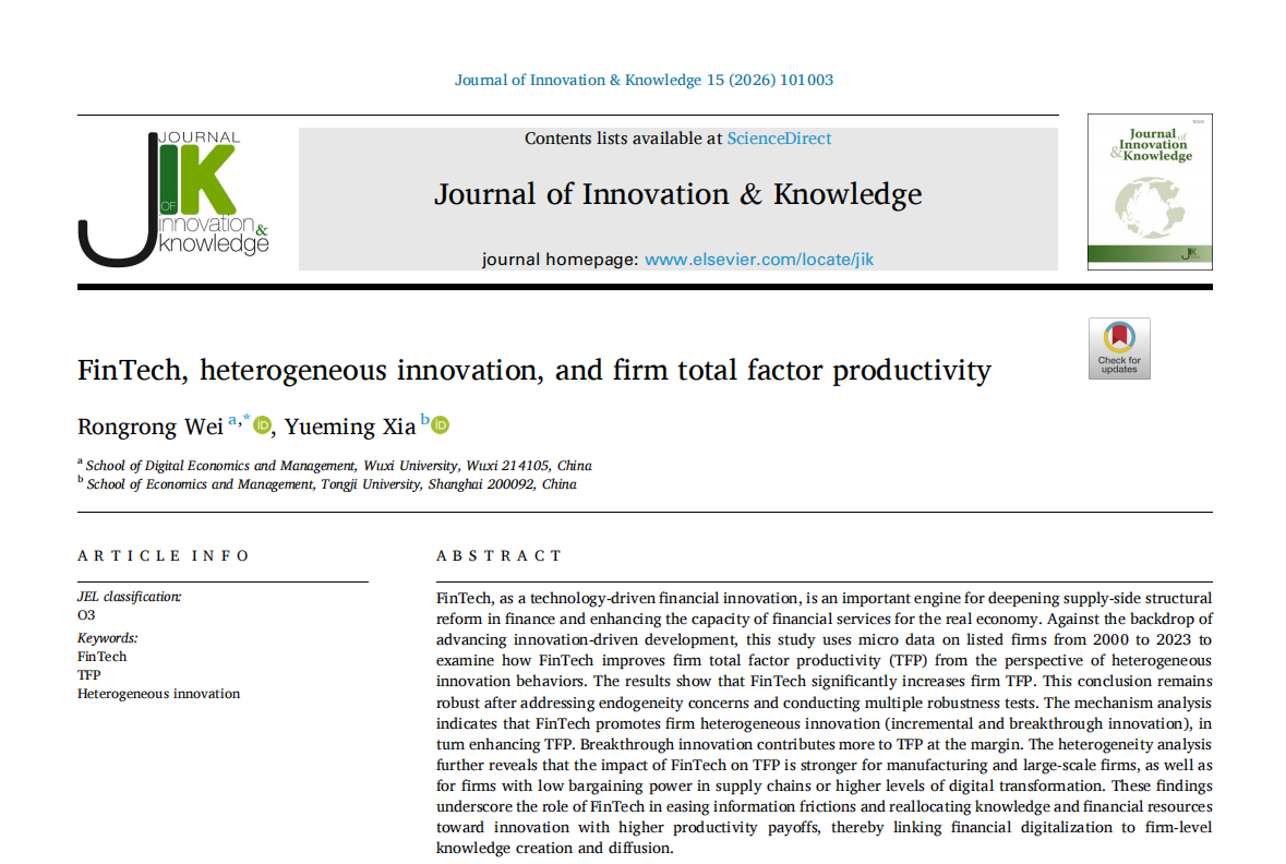 近日,我院魏蓉蓉副教授在SSCI来源期刊《Journal of Innovation & Knowledge》发表题为“FinTech, heterogeneous innovation, and firm total factor productivity”的学术论文。
