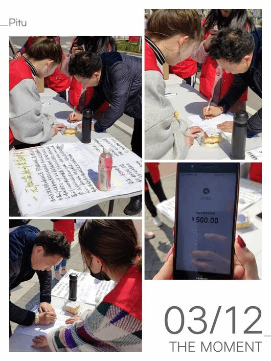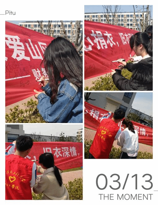 2019年3月13日中午12:10,财管二班的志愿者们在前一天的老地方集合,太阳热辣,令大家意想不到的是,此时已有捐赠者前来等候。滨江学子们带着比昨天更多一份的热情,向需要帮助的人们奉献爱心。有的整个宿舍都动员起来收拾了老半天的旧衣物和用不到的物品,大包小包的拎过来。摆摊前人头攒动,场面气氛使人感动不已,宣传横幅上,签满了爱心捐赠者的名字。
