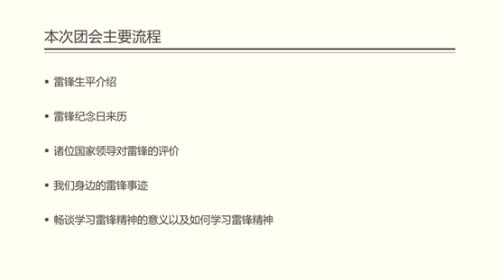 响应毛泽东同志“向雷锋同志学习”的号召,同时为大力弘扬和践行社会主义核心价值观,3月3日晚上我们班全体学生以“构建和谐社会,弘扬雷锋精神”为主题,开展了主题班会活动。