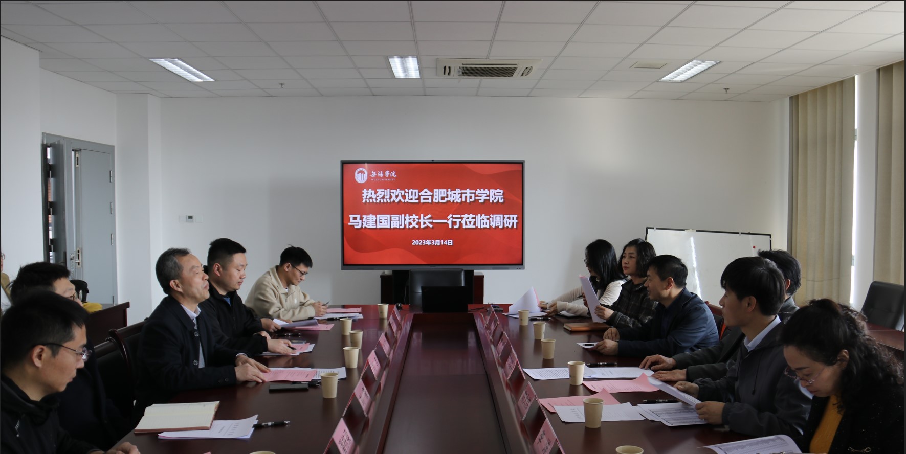 为加强校际交流,进一步提升数字化经管类高素质人才培养质量,3月14日下午,合肥城市学院副校长马建国一行来数字经济与管理学院调研交流。座谈交流会在尚美楼504会议室举行,合肥城市学院副校长马建国,经济与管理学院院长曹泽,教务处处长陈大伟,教务处副处长黄娜,经济与管理学院院长助理李洋,工商管理教研室主任刁雅洁,数字经济与管理学院院长刘军,院长助理孙宁、刘震,国际与贸易系主任高志文、副主任方和远,财务与会计系副主任潘栋梁,院办负责人等参加会议。会议由刘军主持。
