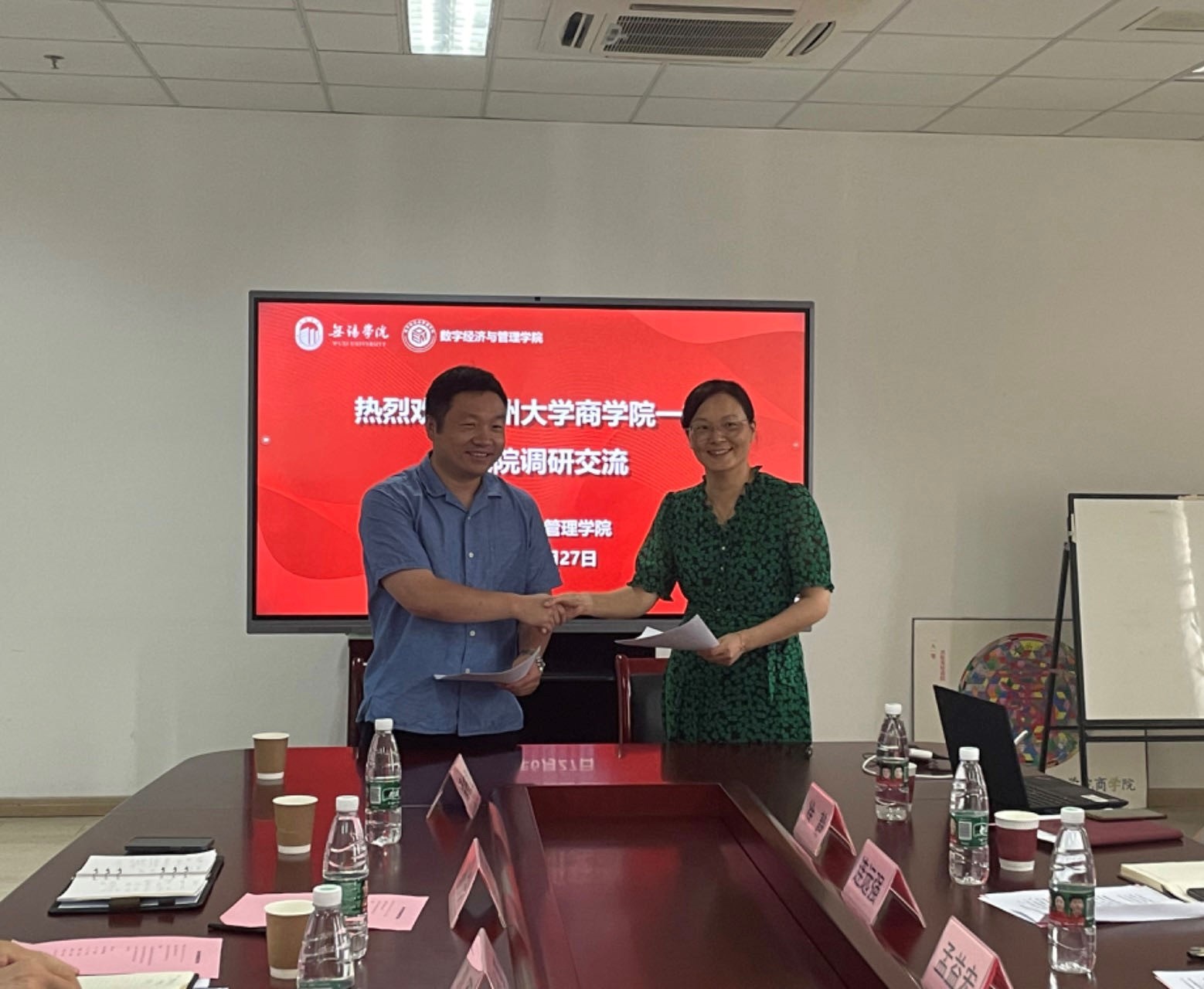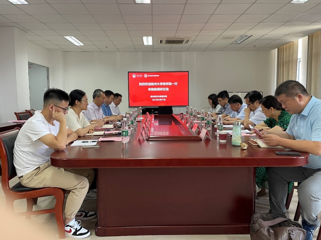 6月27日上午,扬州大学商学院党委书记孟益宏、院长李志斌、副院长连远强、黄春燕、徐静和综办主任许飞一行来数字经济与管理学院调研交流。数字经济与管理学院院长刘军,院长助理孙宁、刘震,财务与会计系副主任潘栋梁、金融与贸易系副主任方和远、工商管理系副主任万晓琴等参加了座谈会。