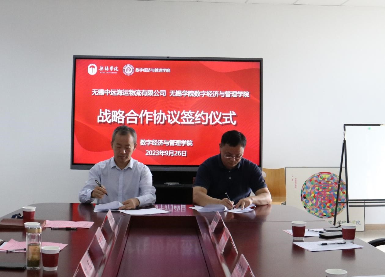9月26日上午,数字经济与管理学院与无锡中远海运物流有限公司签订战略合作协议。无锡中远海运物流有限公司总经理朱礼贤、支部副书记邱佐明等,数字经济与管理学院院长刘军,党总支副书记李诗雅及物流管理专业部分教师参加会议。