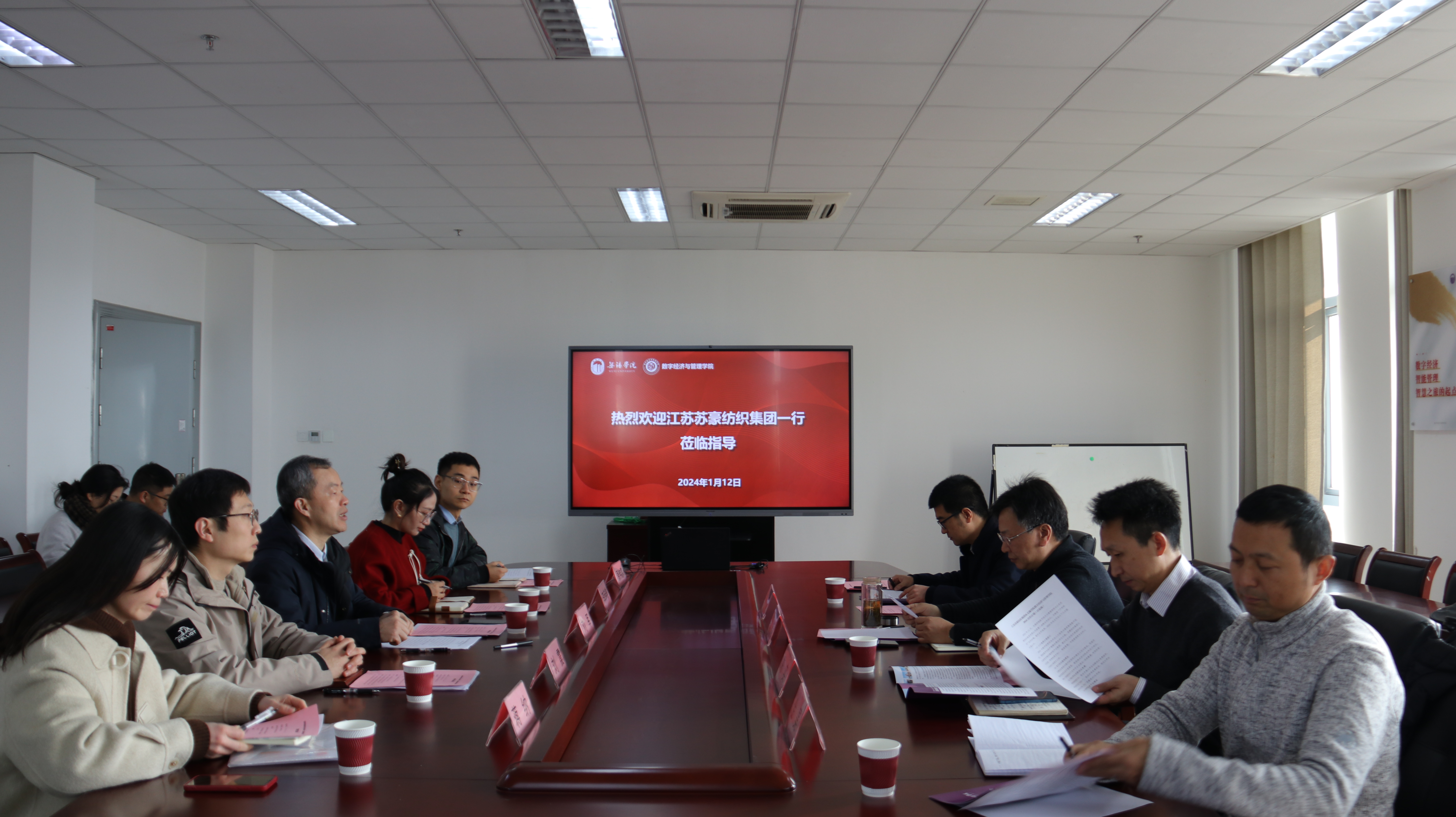 1月12日上午,江苏苏豪纺织集团党委书记、董事长伍栋一行赴数字经济与管理学院洽谈交流。数字经济与管理学院院长刘军,党总支副书记李诗雅,院长助理孙宁、刘震及相关教师代表参加会议。会议由刘军主持。