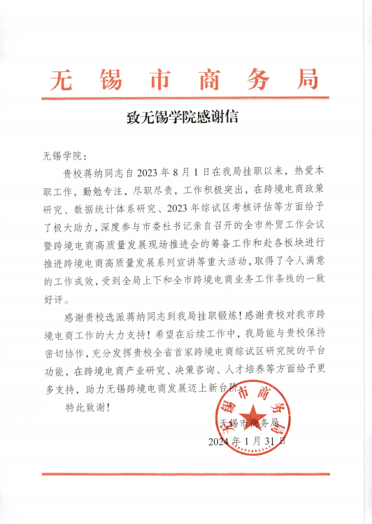 1月31日,无锡市商务局向我校发来感谢信,感谢我校委派蒋纳博士到市商务局挂职。蒋纳博士自2023年8月1日赴市商务局挂职以来,工作积极主动,在跨境电商政策研究、数据统计体系研究、2023年度综试区考核评估等工作中发挥了重要作用,深度参与全市外贸工作会议暨跨境电商高质量发展现场推进会和推进跨境电商高质量发展系列宣讲活动,取得了令人满意的工作成效。无锡市商务局希望在后续工作中,继续与我校保持密切协作,充分发挥我校全省首家跨境电商综试区研究院的平台功能。
