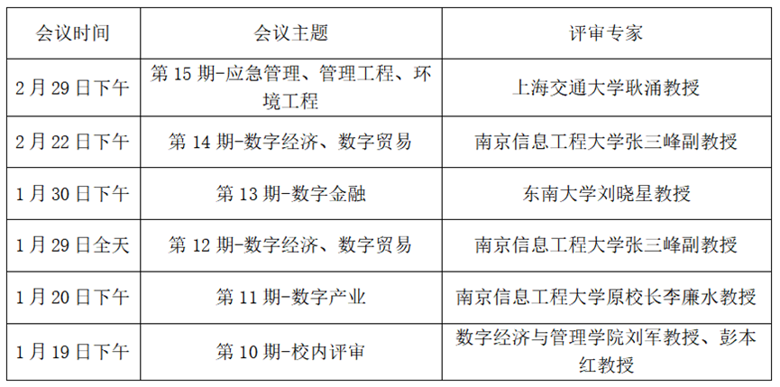 为进一步提升国家级科研项目申报质量,1月19日至2月29日,数字经济与管理学院举办“数字经管科研工作坊”第10-15期系列活动。特邀南京信息工程大学原校长李廉水教授、上海交通大学环境科学与工程学院院长耿涌教授、东南大学刘晓星教授、南京信息工程大学张三峰副教授来校指导,数字经济与管理学院院长刘军及全体青年教师全程参加会议,环境工程学院院长助理卜久贺参会并汇报。