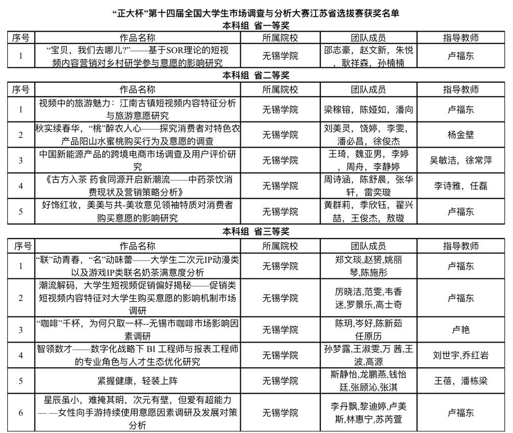 近日,“正大杯”第十四届全国大学生市场调查与分析大赛本科组江苏赛区成绩揭晓,我校数字经济与管理学院12项作品在众多作品中脱颖而出,在本科组江苏赛区荣获一等奖1项,二等奖5项,三等奖6项。