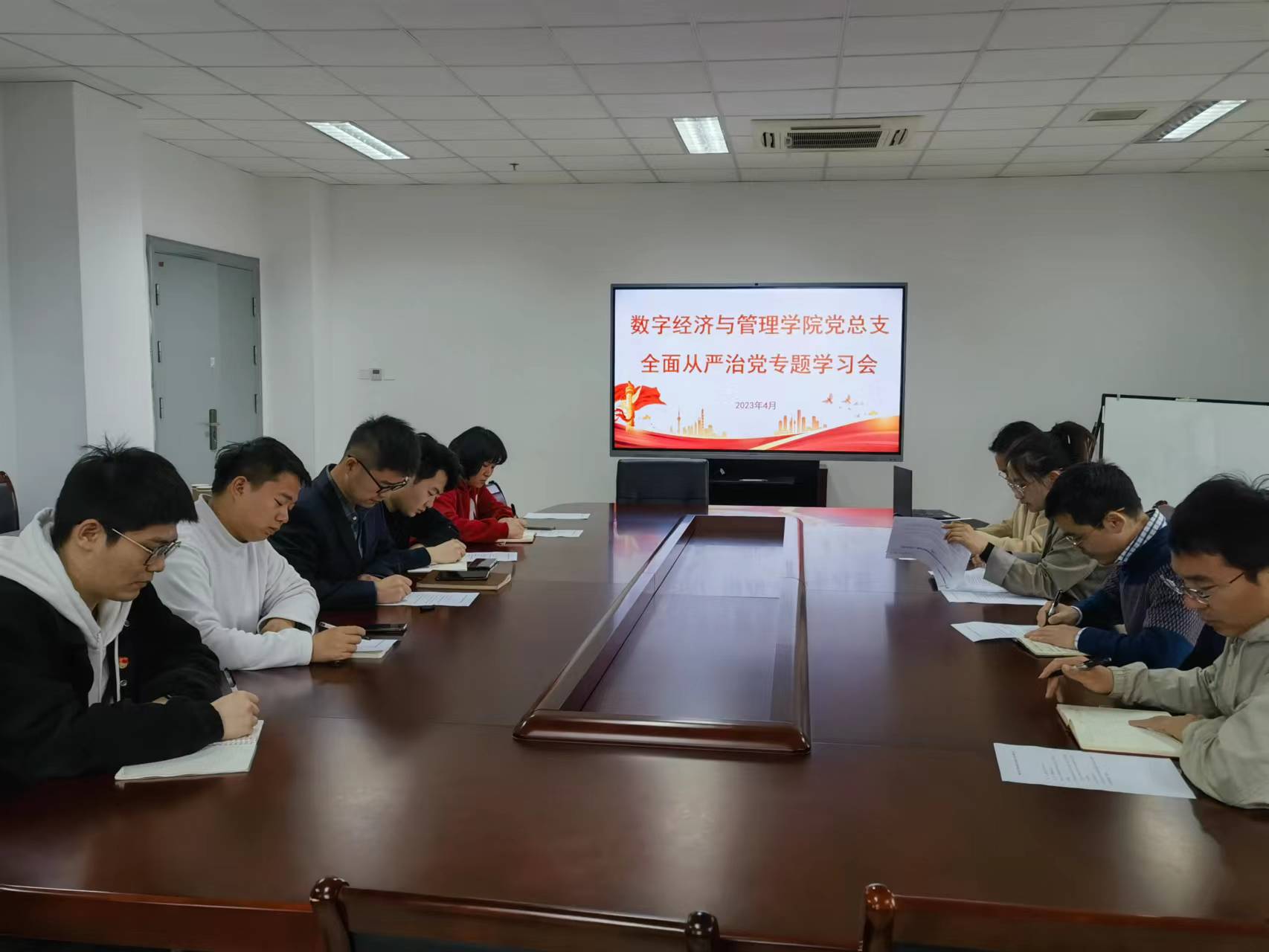 为深入学习贯彻党的二十大精神,加强党风廉政建设工作,4月4日,数字经济与管理学院党总支在尚美楼504会议室召开全面从严治党专题学习会。会议由学院党总支副书记李诗雅主持,全体支部书记参加。
