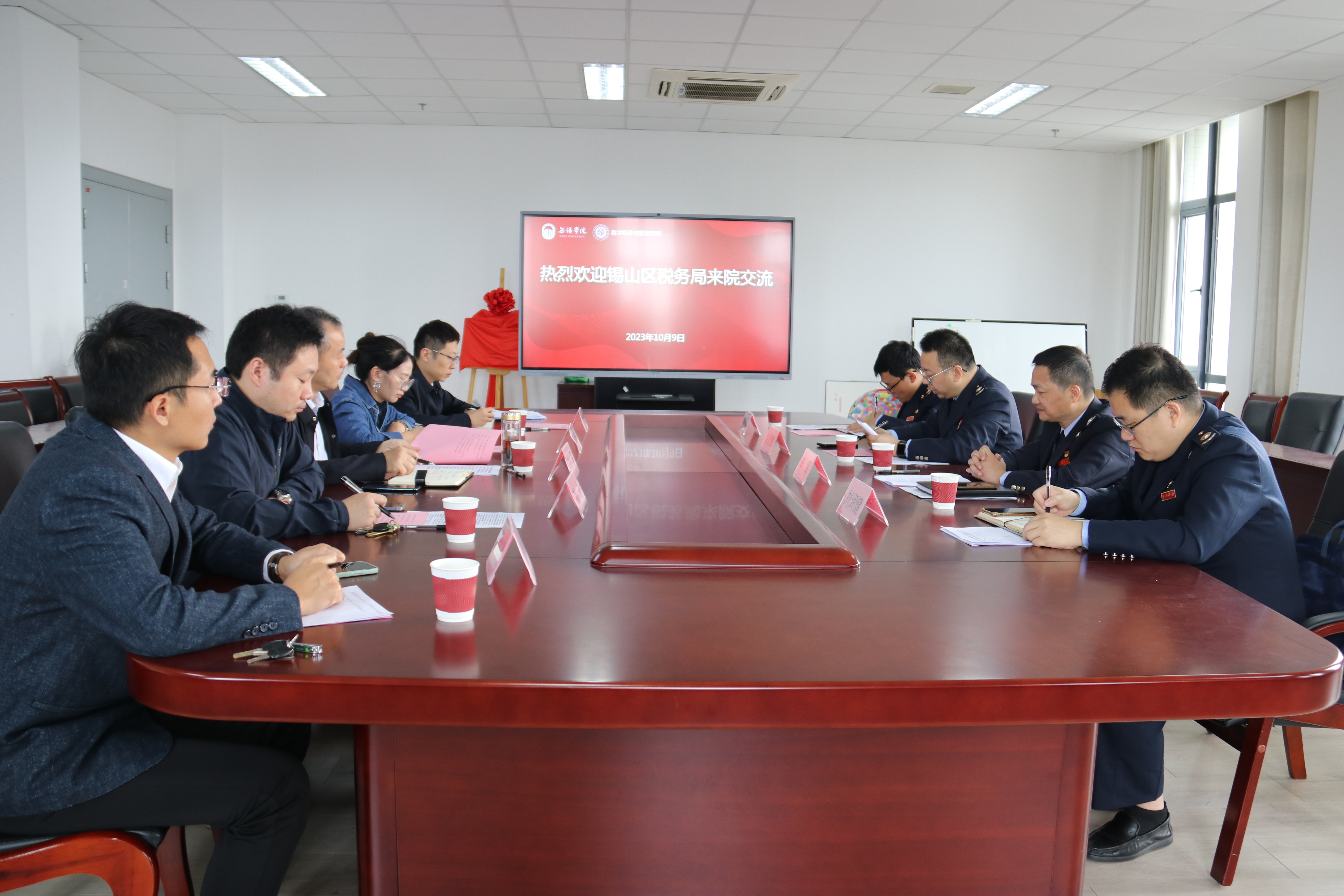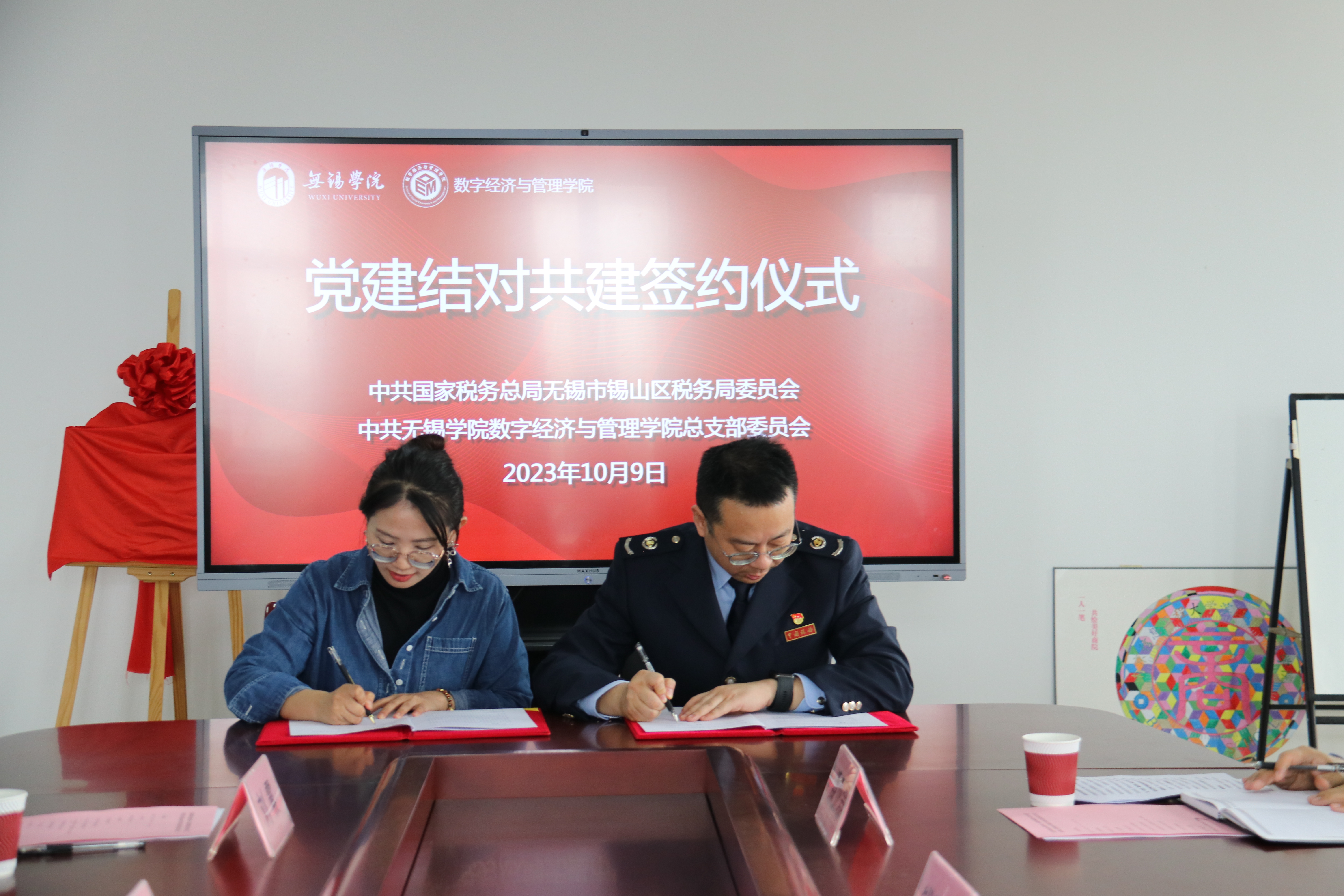 10月9日上午,数字经济与管理学院与锡山区税务局在尚美楼504会议室举行党建结对共建合作协议签约仪式。锡山区税务局党委书记、局长李军,党委委员、副局长钱浩然,党建工作股股长刘润健,团总支书记潘亚磊出席了会议;数字经济与管理学院院长刘军,党总支副书记李诗雅等相关工作人员参加了会议。