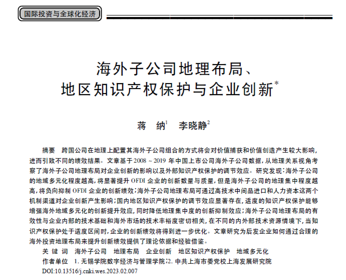 近日,我院蒋纳博士在CSSCI来源期刊《世界经济研究》发表题为“海外子公司地理布局、地区知识产权保护与企业创新”的学术论文。