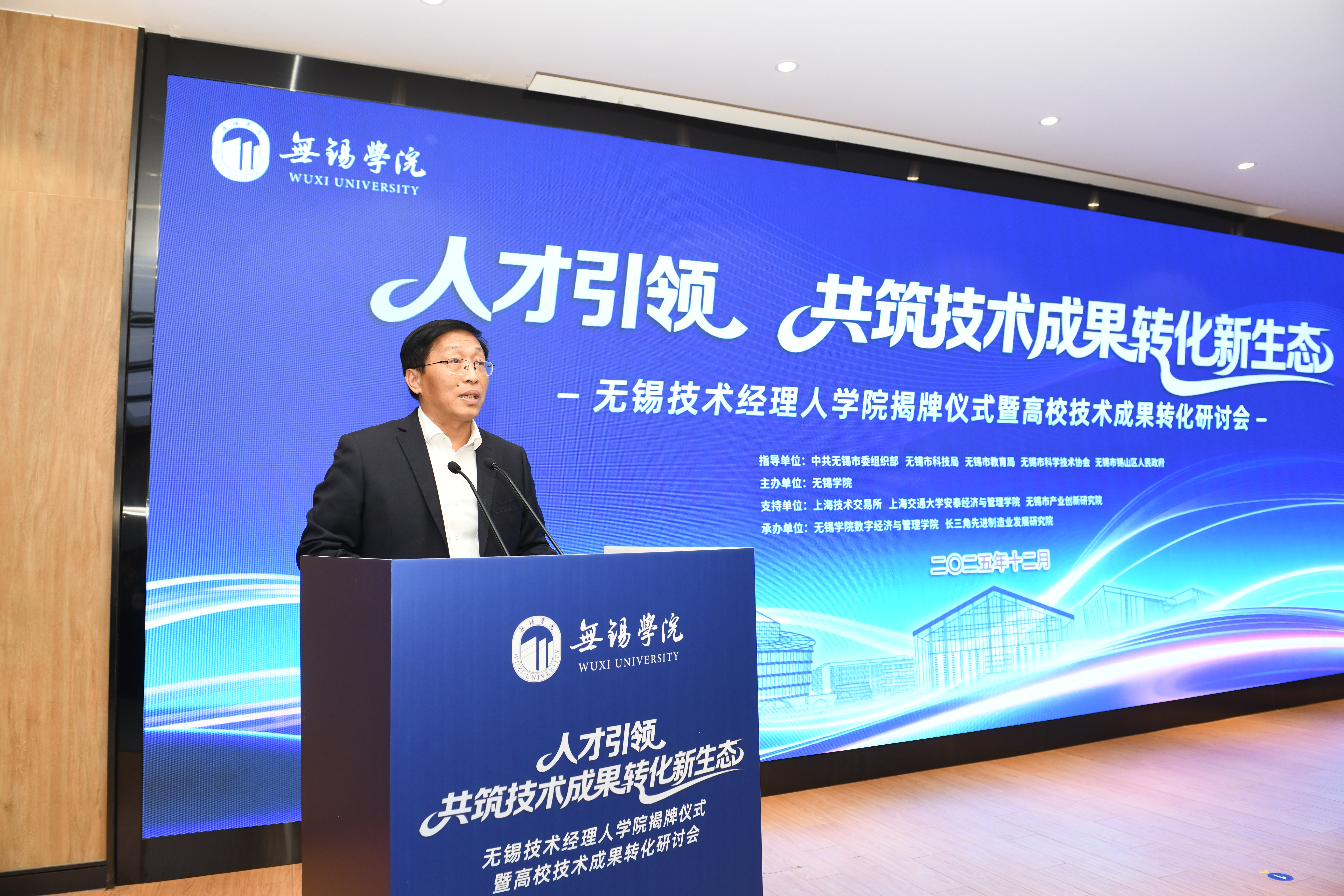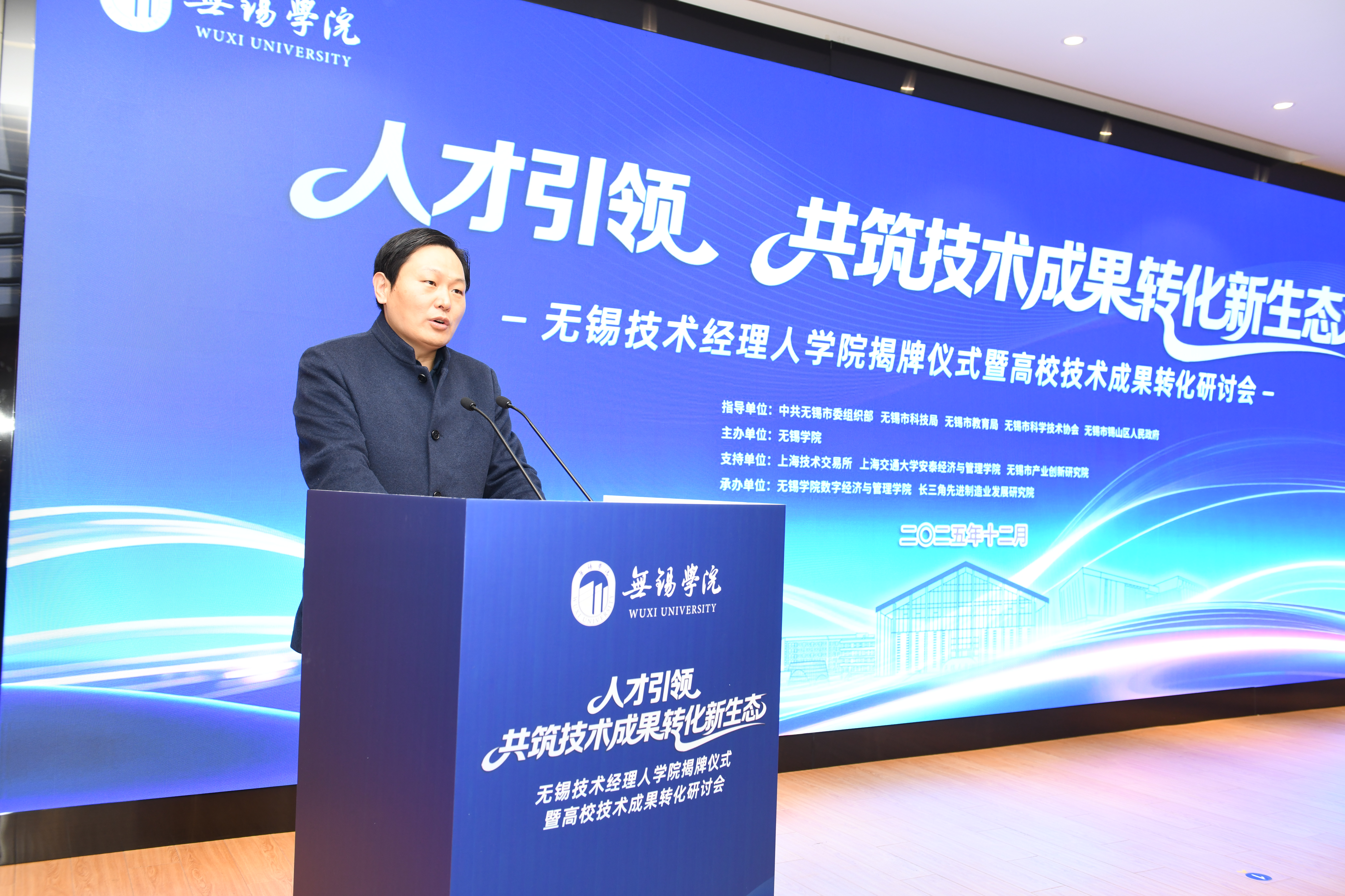 张永宏在致辞中系统介绍了学校在产教融合、人才融通、科教融汇等方面取得的成效。他指出,成立无锡技术经理人学院,是学校贯彻落实党中央决策部署,推进技术创新与成果转化工作的重要举措,是争当“双高协同”工作示范表率、服务地方创新发展的具体行动,更是实现“新型应用型大学”建设目标的内在需求。学校将以“地方所需、学校所能”为原则,着力构建贯通式人才培养体系,打造技术交易集市实战平台,推进国家大学科技园与技术经理人学院联动发展,全力将学院建设成为省内领先、特色鲜明的技术转移人才育成高地,为无锡乃至区域高质量发展注入持续动能。